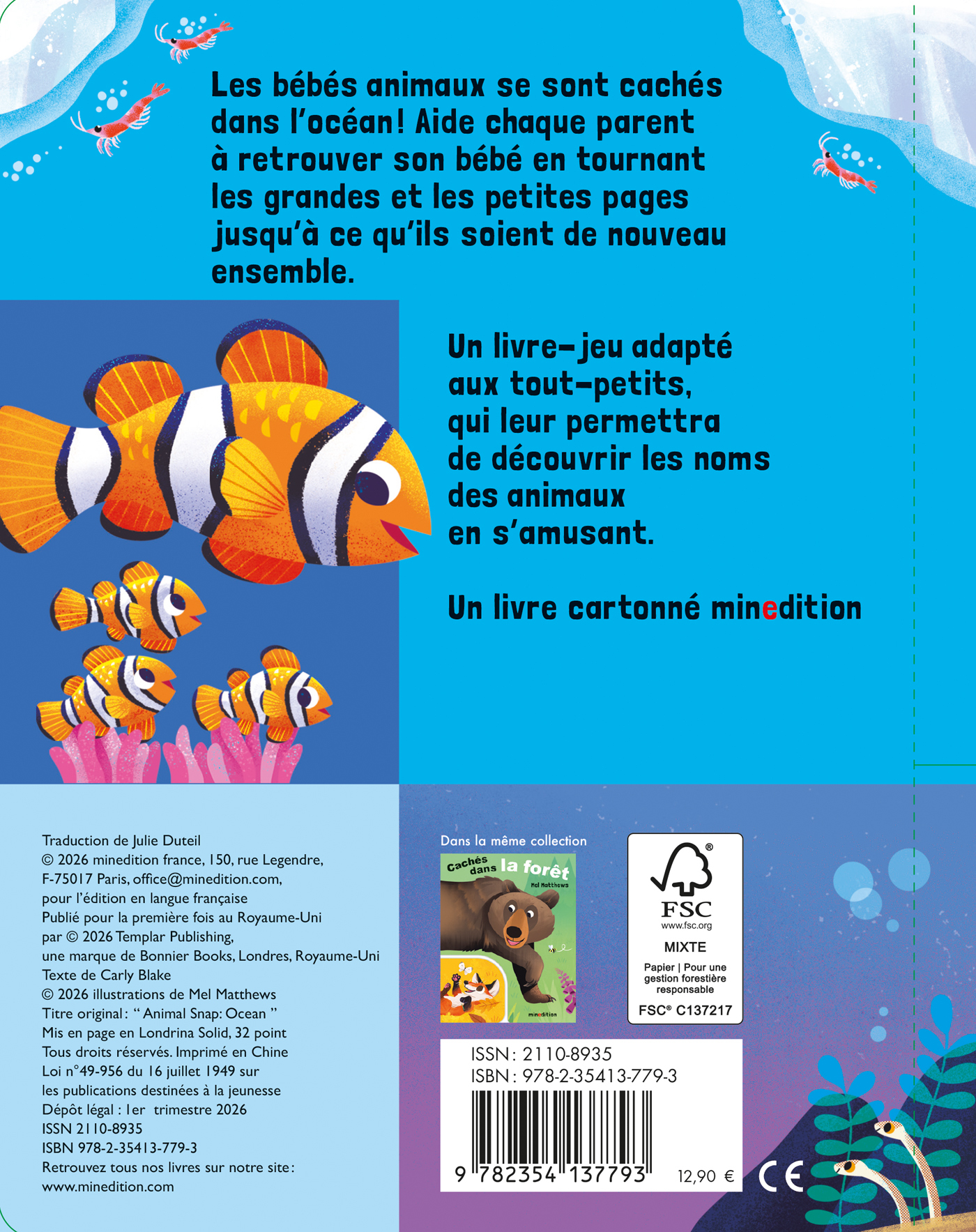 Les bébés animaux se sont cachés dans l’océan ! L’enfant lecteur aide chaque animal à retrouver son bébé en tournant les grandes et les petites pages jusqu’à ce qu’ils soient de nouveau ensemble. Un livre-jeu adapté aux tout-petits qui leur permettra de découvrir les noms des animaux en s’amusant.